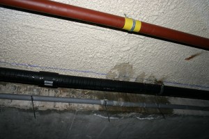 Las humedades debidas a agua en circulación son sencillas de reparar, sin más que actuar en el punto donde se haya producido la fuga: tuberías, impermeabilización de cubierta, bajantes… Aquí lo complicado es localizar la fuga, puesto que no siempre coincidirá con donde aparezca la humedad: el agua puede discurrir por cualquier elemento que encuentre, hasta que salga donde la vemos. Suelen aparecer cerca de los cuartos húmedos, o en las últimas plantas, si es un problema de la cubierta.