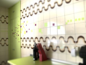 en cocinas y baños nos encontramos alicatados con diseños pasados de moda. Cambiar el alicatado es costoso. Una alternativa es la pintura sobre azulejo, aunque no suele dar muy buenos resultados. Con el vinilo, si bien, no podemos cubrir toda la superficie alicatada, sí podemos utilizar trozos pequeños, adheridos sobre los azulejos, nunca sobre las juntas, para dar un toque diferente a la pared. En este caso se utilizó vinilo de 2 colores para tapar numerosos agujeros existentes en los azulejos y dar un toque distinto a un viejo alicatado, integrándolo con un armario empotrado .